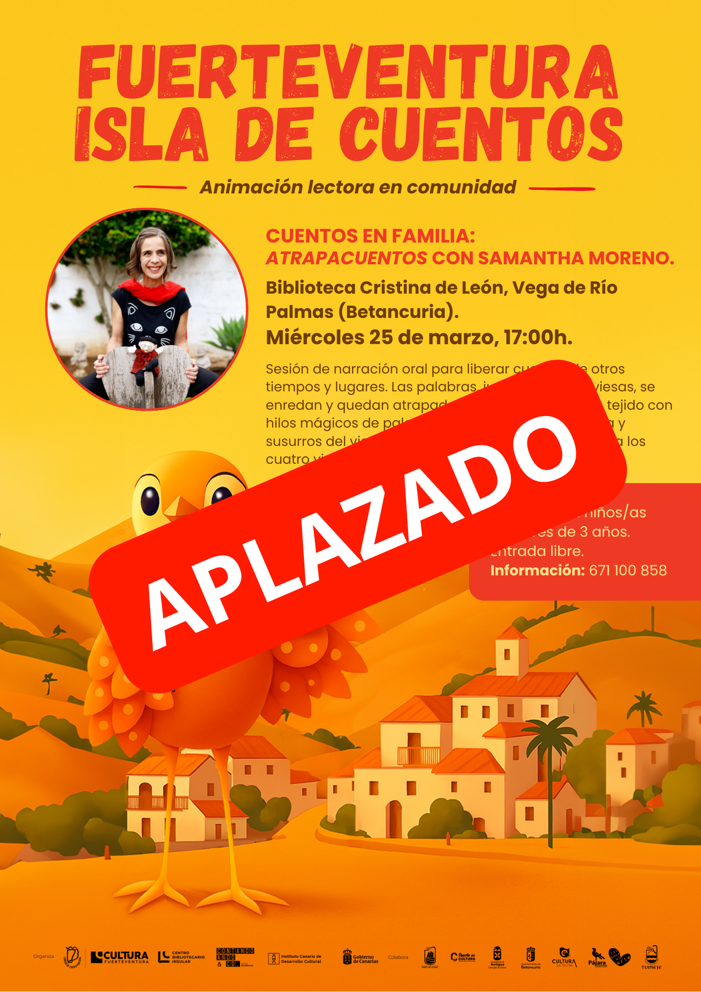 *Evento aplazado* FUERTEVENTURA ISLA DE CUENTOS, Animación lectora en comunidad: “Atrapacuentos” con Samantha Moreno. FECHA: miércoles 25 de marzo HORA: 17:00h LUGAR: Biblioteca Cristina de León, Vega de Río Palmas […]