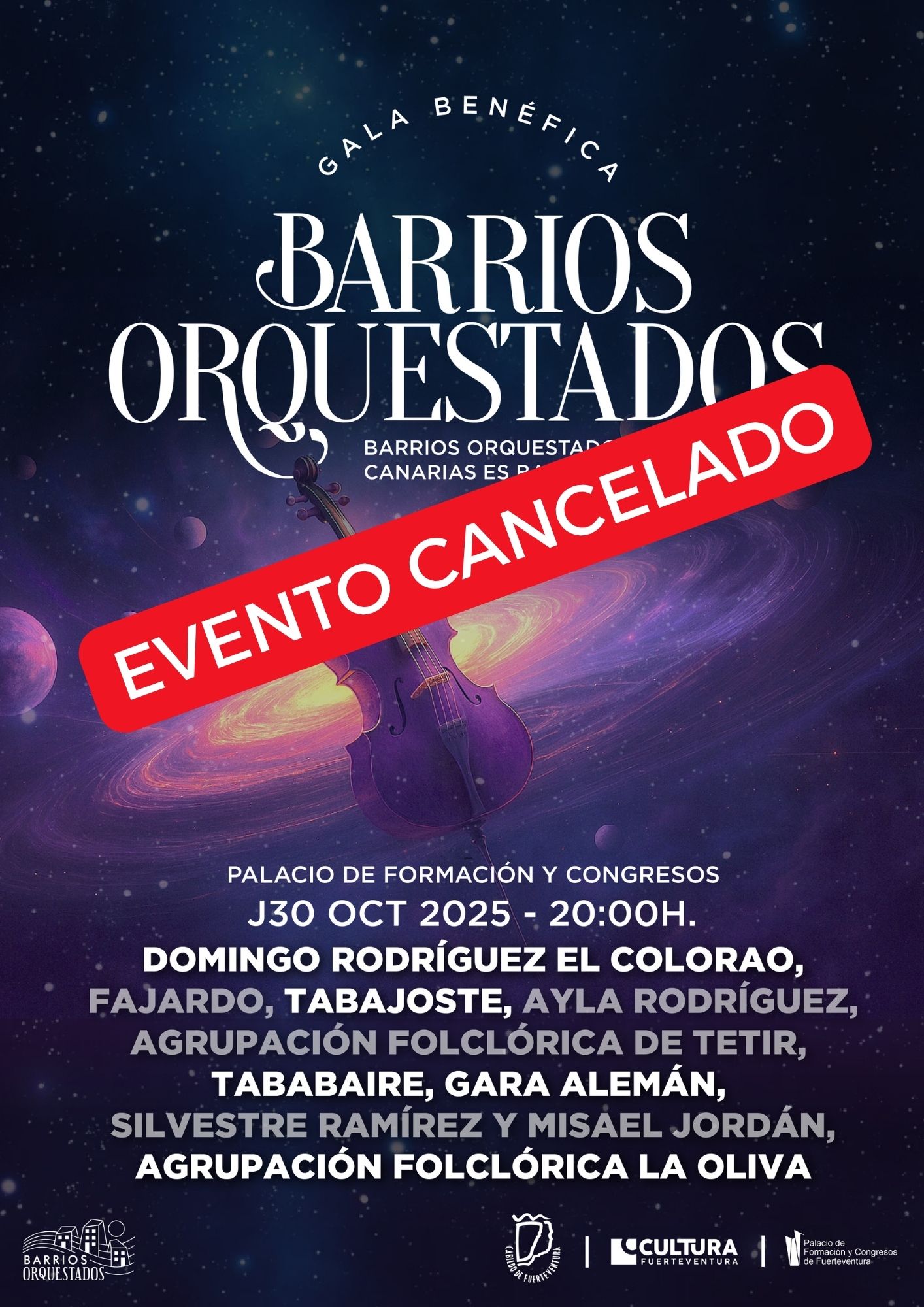 ⚠️ Cancelada la Gala Benéfica de“Barrios Orquestados” Informamos que el evento de Barrios Orquestas previsto para el 30 de octubre en el Palacio de Formación y Congresos ha sido cancelada. 🎟️ La ticketera procederá a la devolución íntegra de las entradas de forma automática a las personas que las adquirieron. Comprar entradas