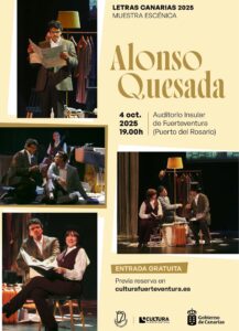 Cronista, poeta y siempre ácido espectador de la vida así presentamos a nuestro autor en este retrato a través de una selección de piezas. Una maleta llena de libros, montañas de periódicos y algunas lámparas son elementos de un espacio escénico habitado por tres actores y una chelista. La música de Camille de Saint-Saëns y las crónicas sociales acompañan este paseo por la obra de Quesada en una propuesta a medio camino entre la lectura dramatizada y el teatro de salón. La luz y las proyecciones sobre un ciclorama a media altura potenciarán la atmósfera anímica de este juego teatral en el que pondremos voz a las palabras de Alonso Quesada, para celebrar el Día de las Letras Canarias 2025