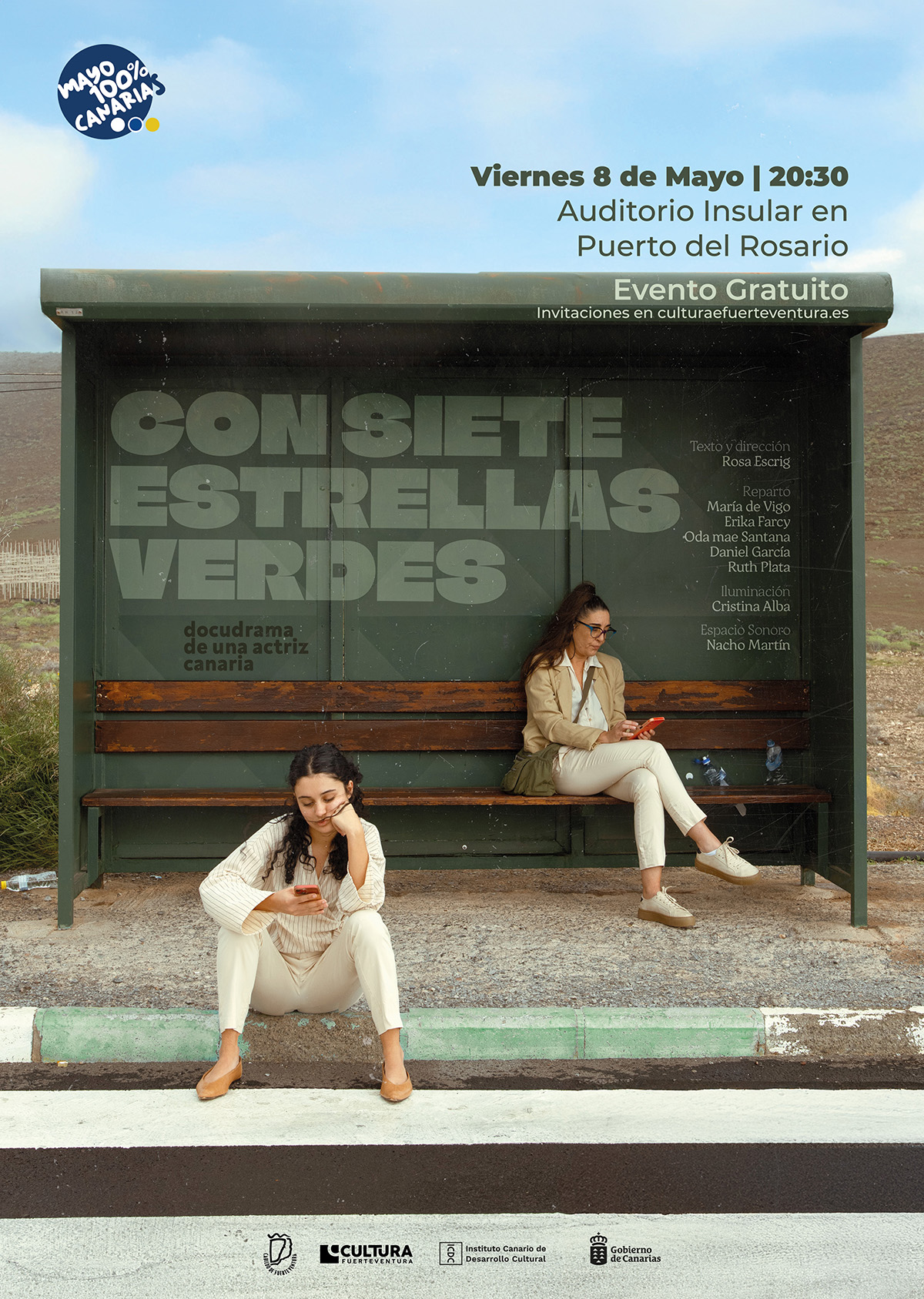 Con siete estrellas verdes, de la compañía Escrig Producciones, es un espectáculo de autoficción que fusiona teatro documental, conferencia performativa y thriller político. A través de la historia de una joven canaria contratada para una película sobre el accidente aéreo de Los Rodeos en 1977, la obra indaga en la manipulación del relato histórico, los movimientos independentistas y el papel geopolítico de Canarias.