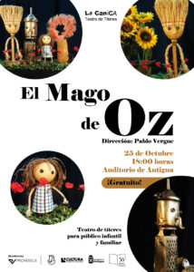 Escobas, fregonas, cacharros, utensilios de cocina y objetos diversos dan vida a esta divertida y sugerente versión del Mago de Oz. Una niña que desea volver a su casa, un espantapájaros que quiere tener un cerebro para poder pensar, un hombre de hojalata que anhela tener un corazón para poder sentir y un león cobarde que quiere tener valor emprenden un viaje hacia ciudad Esmeralda en busca del Mago de Oz. Un viaje en el que sus protagonistas aprenderán el valor de la amistad, la ternura, la comprensión y la ilusión. La Canica Teatro es una compañía fundada en 2005 e integrada por profesionales provenientes de distintas ramas artísticas (artes plásticas, teatro, danza, música…), “La Canica” se ha propuesto crear espectáculos de carácter multidisciplinar poniendo un especial acento en la interpretación y en la exploración de materiales y otros recursos escénicos con el fin de construir personajes e historias cercanos al mundo infantil. Sus espectáculos cuentan con una entusiasta y calurosa acogida por parte del público y programadores culturales. “La Canica” trata de desarrollar un lenguaje escénico propio, un lenguaje que cree un espacio de encuentro entre los Títeres y el Teatro, entre el Cuerpo y los Objetos.