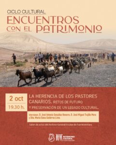El próximo 2 de octubre tendrá lugar una nueva edición de Encuentros con el Patrimonio, dedicada a la herencia cultural de los pastores canarios y a los retos de futuro para preservar este legado tan frágil. En esta ocasión participarán D. José Antonio González Navarro, doctor en Antropología y técnico del Servicio de Patrimonio Histórico del Cabildo de Gran Canaria, y D. José Miguel Trujillo Mora, antropólogo que desarrolla su labor profesional en la isla de La Gomera, bajo la moderación de la doctora en antropología Dña. María Elena Gutiérrez Lima.