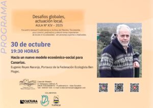 En esta nueva sesión, Eugenio Reyes Naranjo, portavoz de la Federación Ecologista Ben Magec, abordará el tema “Hacia un nuevo modelo económico-social para Canarias”, invitándonos a repensar nuestro futuro desde una mirada sostenible, justa y comprometida con el entorno