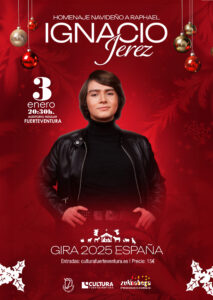Desde Chile llega Ignacio Jerez con su verdadero y único homenaje a El Niño, el incomparable Raphael. Un espectáculo cargado del espíritu navideño del Divo de Linares, que reúne en un solo show la magia de más de 60 años de éxitos y una trayectoria inolvidable. En una noche llena de emoción e intensidad musical, cada gesto, cada nota y cada palabra transmiten el amor, respeto y admiración por la obra del ídolo de tantas generaciones. Ven a vivir esta experiencia navideña junto a Ignacio Jerez, donde el alma de Raphael y el espíritu de la Navidad se unen para celebrar estas fiestas de una forma única e inolvidable.