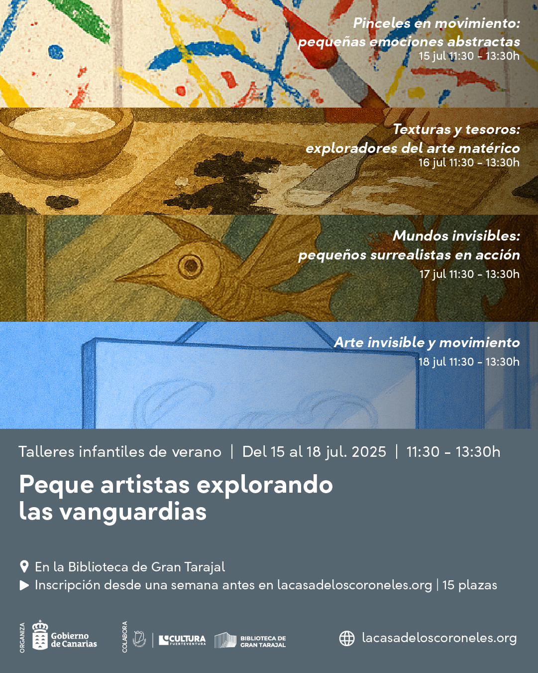 “Peque artistas explorando las vanguardias” es una propuesta de talleres creativos infantiles que se desarrollará en la Biblioteca de Gran Tarajal, en colaboración con el Departamento de Artes Plásticas del Gobierno de Canarias. Esta iniciativa surge con el objetivo de dinamizar espacios culturales no convencionales a través de las artes plásticas, acercando a los más pequeños al arte contemporáneo de una forma lúdica, sensorial y significativa. La actividad se enmarca dentro de una estrategia más amplia de fomento del arte y la cultura desde una perspectiva educativa e inclusiva, con especial interés en poner en valor el arte producido en Canarias y su diálogo con las corrientes artísticas internacionales del siglo XX. El ciclo propone un acercamiento a las vanguardias desde la experimentación, el juego y la libre expresión, estimulando la imaginación y la creatividad, claves esenciales en el desarrollo de la infancia.